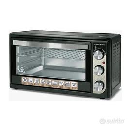 Capacità lt. 45, timer con segnale sonoro 0-60’, termostato regolabile 100÷230°C, funzioni: Base, Grill, Combinata, Ventilata, sportello con doppi vetri e pareti termoisolate, maniglia termoisolata, Accessori: griglia,