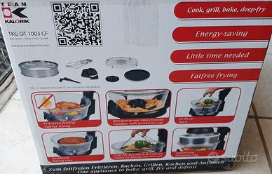 La friggitrice e forno due in uno TKG OT 1003 CF Kalorik è un apparecchio combinato molto pratico. Fungendo da forno e da friggitrice, ti permette di guadagnare tempo e spazio nella tua cucina.
