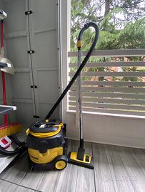 Aspiratore professionale Karcher T15/1 con tubo di aspirazione telescopico, completo di sacchetti di ricambio e accessori.