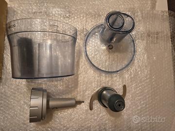 Inoltre include boccale frullatore in plastica con set da 6 differenti lame per tagliare e 3 vasetti in vetro con relativi tappi per macinare caffè, frutta secca o frullare piccole dosi.
