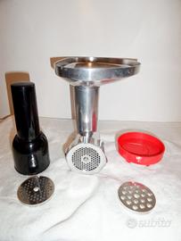 Vendo robot da cucina Kenwood Chef XL modello KVL4100S motore potente da 1200W e ciotola inox da 6,7 litri. Macchina perfetta per grandi lievitati e preparazioni professionali. L’offerta è comprensiva dei seguenti accessori originali Kenwood: Frusta K (K-Beater) Gancio Impastatore Frusta a filo At512: Spatola per pasticceria per incorporare aria e creme. KAX950ME: Tritacarne in metallo con trafile e pressa hamburger tescoma KAX720PL : Estrattore di succo a bassa velocità (PureJuice). KAX980ME: Sfogliatrice (Lasagne Roller) in acciaio inox KAH358GL: Caraffa in vetro Thermoresist da 1,6L (resistente al calore). At320a : Multi-Mill (Tritatutto compatto) completo di 3 contenitori in vetro con coperchio. KAH647PL : Food Processor (venduto specificatamente come pezzi di ricambio/parti danneggiate). Condizioni: Macchina e accessori perfettamente funzionanti (eccetto il Food Processor come indicato). Prezzo per il blocco completo: 600€