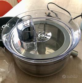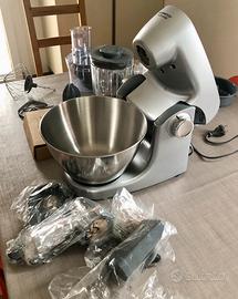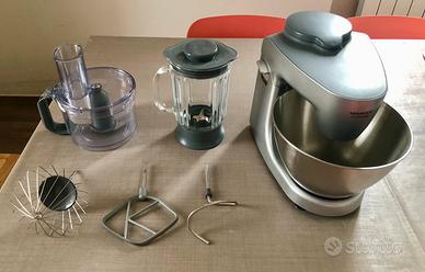Vendo Kenwood Multione usato pochissimo,perfettamente funzionante,praticamente quasi nuovo,completo di tutti i suoi accessori originali: Impastatrice Planetaria Prospero+, Ciotola in acciaio da 4,3L, Robot da 1,4L con 3 dischi, Spremiagrumi, Frullatore da 1,2L, 1000W, colore acciaio cromato come da foto.