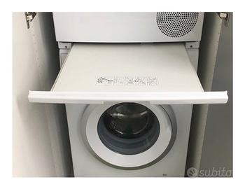 Supporto originale Bosch WTZ27400 che permette di sovrapporre l’asciugatrice alla lavatrice. È dotato di ripiano estraibile su cui poggiare un contenitore del bucato o direttamente gli indumenti quando si svuota l’asciugatrice.