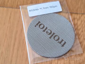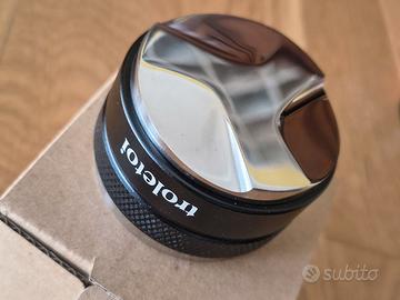 Kit di accessori per macchine per caffè espresso dotate di portafiltro da 54mm. Il kit, di marca Troletoi, è composto da: - Pressino/livellatore regolabile, interamente in metallo (peso 500g). - Anello svasato che fa da imbuto nel versare la polvere di caffè nel portafiltro, in alluminio e dotato di 4 magneti che lo tengono in posizione. - Filtro in rete d'acciaio (di 1,7mm di spessore ) da interporre tra doccetta e portafiltro per rendere più omogeno il flusso dell'acqua. - Nottolino con aghi in acciaio per mescolare la polvere di caffè nel portafiltro, per renderla omogenea e senza grumi. Con istruzioni in italiano, spagnolo e tedesco. Nuovo in confezione originale.