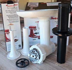 Vendo per inutilizzo set di accessori originali KitchenAid, praticamente nuovi. Sono stati utilizzati una sola volta e poi riposti nelle loro scatole originali, come visibile in foto. Il kit comprende: Tritatutto (Mod. 5KSMFGA): Ideale per macinare carne fresca per hamburger, polpette e ragù, ma anche formaggi e pane. Kit Insaccatore (Mod. 5KSMSSA): Due tubi di diverse dimensioni per fare in casa salsicce, salamini e wurstel con ingredienti sani.