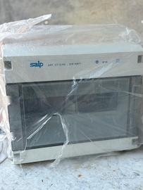 1x Centralino da parete Saip (Art. CT 12 NS): Quadro elettrico stagno con grado di protezione IP55. Predisposto per l'alloggiamento di 12 moduli DIN (interruttori magnetotermici, differenziali, ecc.). Dotato di sportello trasparente fumé per una facile ispezione visiva.
