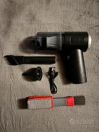 Un piccolo aspirapolvere portatile nero con una varietà di accessori in omaggio: un attacco con spazzola a setole dure, un ugello stretto, un cavo di ricarica USB, un ugello a imbuto e una spazzola con setole morbide, e un panno in microfibra . Ideale per la pulizia di piccoli spazi e oggetti, questo kit compatto è pratico e versatile.