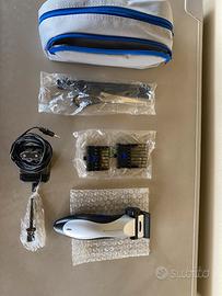Remington, con due distanziatori di misura diversa, pettine, forbice, pennellino per la pulizia della lama e astuccio per riporre il tutto.