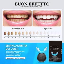 【Rendi i Tuoi Denti più Bianchi e Luminosi】Il nostro sbiancante denti professionale utilizza una tecnologia innovativa con una sorgente Lampada 16 LED Blu e una formula efficace.La luce blu aiuta a rimuovere le macchie ostinate sulla superficie dei denti,migliorando visibilmente il desiderato sbiancamento denti e lasciando il sorriso più brillante e naturale.