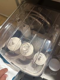 Usato perfettamente funzionante con anche accessori nuovi. Descrizione del prodotto Tipo di prodotto Robot da cucina Serie KitchenAid Artisan Funzioni e caratteristiche Cosa può fare il robot da cucina Pressare, tritare il ghiaccio, spremere, sminuzzare, mescolare, tritare, affettare, sminuzzare, grattugiare, impastare, grattugiare, mescolare, battere Funzioni regolazione continua della velocità, funzione a impulsi, induzione Capacità della ciotola di miscelazione 4 litri Proprietà della ciotola acciaio inox, con manico Dispositivo di sicurezza Protezione da sovraccarico Dotazione Sono inclusi Tamper, spremiagrumi, affettatrice continua, ciotola di miscelazione, lama per affettare, lama per impastare, coperchio, frusta, collo di riempimento, paraspruzzi, spatola Dischi di lavoro in dotazione Disco da taglio, disco per grattugiare, disco per grattugiare accessori in dotazione Contenitore, supporto per accessori Elementi operativi Comando rotante Colore e materiale Colore colore nero Materiali dell'alloggiamento Metallo, plastica Materiale della vasca Plastica Materiale dell'attacco del frullatore Acciaio inox Dati tecnici Potenza (W) 650 watt Livello di velocità 2 Amperaggio 16 A Dimensioni e peso Peso di 13,6 kg Larghezza 30,4 cm Altezza 45,7 cm Profondità 24,8 cm