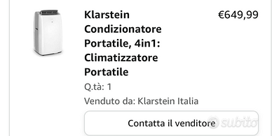 Vendo condizionatore portatile Klarstein top di gamma, acquistato a Giugno 2023 e utilizzato soltanto per una stagione estiva. L’apparecchio è perfetto, pari al nuovo, e lo vendo esclusivamente perchè ho traslocato in una casa già dotata di impianto fisso.