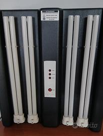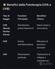 lampada UVA / UVB per fototerapia e lampada infrarossi per fotobiomodulazione. Le lampade UV promuovono la produzione di vitamina D ed un valido contributo nel trattamento di condizioni dermatologiche. Mentre le lampade a luce rossa e infrarossa migliorano la produzione dell'energia e promuovono la stimolazione di collagene ed elastina favorendo un ringiovanimento cutaneo. Possibilità di acquistarle separatamente.