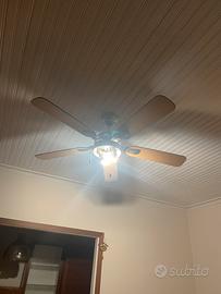 Lamoadario con ventilatore e luce a due lampadine, lanpalla di copertura ce . In legno e ortone . Smontaggio e ritiro a carico di chi acquista.