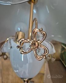 lampadario vintagein vetro di murano con struttura in ottone, probabilmente risalente agli anni '70. Presenta una combinazione di vetro bianco opalino, che ha un aspetto semi-opaco, e dettagli in ottone color oro, inclusi elementi decorativi a forma di fiore.