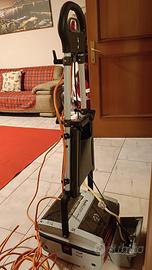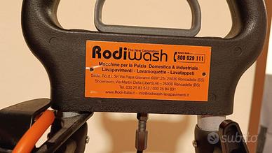 Rodiwash R24N È il modello più compatto della gamma, ideale sia per uso domestico avanzato che professionale in spazi ristretti. Elementi di riconoscimento: Larghezza spazzola: Se la parte pulente è larga circa 24-25 cm, è sicuramente la R24N. Se fosse più larga (circa 34 cm), sarebbe il modello R34. Design: Il manico a "D" e il sistema di fissaggio del cavo arancione sono caratteristici dei modelli prodotti negli ultimi anni. Funzionamento: Utilizza due spazzole cilindriche controrotanti (quelle rosse visibili in basso) che sollevano lo sporco e lo proiettano sulla spazzola di recupero. A cosa serve: Questo modello è celebre per la sua capacità di pulire a fondo le fughe delle piastrelle, il cotto, il gres porcellanato ruvido e i tappeti/moquette, superfici dove le normali lavasciuga spesso faticano.