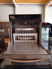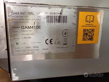 Marca: Krupps Modello: GAM410E (Linea GAM / Compack) Anno indicativo: 2018 Tipologia: Lavabicchieri professionale sottobanco ________________________________________ Caratteristiche Tecniche •Alimentazione elettrica: Trifase 400V •Struttura: Acciaio inox AISI 304 •Dimensioni cestello: 400 x 400 mm •Produzione oraria: fino a circa 30 cestelli/ora •Comandi: Pannello elettronico •Dosatori: oDosatore brillantante integrato oDosatore detergente integrato ________________________________________ Funzionalità e Dotazioni •Sistema di lavaggio ad alta efficienza •Tecnologia di risciacquo Acquatech (pressione e temperatura costante) •Sistema di autodiagnosi integrato •Cicli di lavaggio rapidi (ideali per bar e caffetterie) •Pompa di lavaggio ad alte prestazioni •Bracci di lavaggio e risciacquo in materiale resistente •Vasca stampata con angoli arrotondati (facile pulizia) ________________________________________ Prestazioni •Ciclo di lavaggio: rapido (indicativamente 90–120 sec) •Consumo acqua per ciclo: ridotto •Temperatura risciacquo: controllata per garantire igienizzazione ________________________________________ Applicazioni Ideali •Bar •Caffetterie •Pub •Gelaterie •Locali con alta rotazione di bicchieri e tazzine ________________________________________ Punti di Forza •Compatta e robusta •Elevata velocità operativa •Bassi consumi •Facilità d’uso e manutenzione •Affidabilità del marchio Krupps