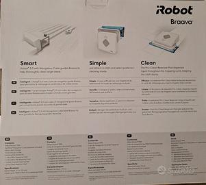 iRobot Braava 390T Lavapavimenti 2 in 1, Pulizia a Secco e a Umido, Adatto per Pulire Stanze e Grandi Spazi, Fino a 92 Mq, con Panni Usa e Getta e Lavabili, Silenzioso, Bianco Due modalità di funzionamento (vedi immagine): 1) pulizia a Secco con Panni monouso tipo swiffer 2)lavapavimenti con Panni specifici (due inclusi) tramite vaschetta contenitore Poco usato, scatola originale ed istruzioni. Vendo per acquisto di uno piu grande.