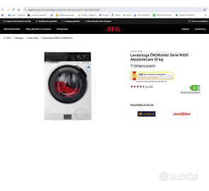 lavasciuga AEG modello LWR9C16AB ÖKOKombi Serie 9000 AbsoluteCare 10 kg lavaggio 6 Kg asciugatura CLASSE ENERGETICA (NUOVA) B Dimensioni HxLxP (mm): 870x597x636 specifiche complete sul sito AEG il prodotto è nuovo, ancora imballato, mai utilizzato e mai collegato visibile a monza meglio ritiro a mano visti i costi di spedizone con corriere, ma in caso di interesse , si possono concordare. Eventuali altre info su richiesta