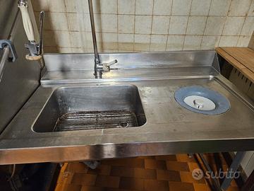 Completa di tavolo, con buco x scarico rifiuti, collegato alla macchina x il carico delle stoviglie compreso di lavandino con doccione x il risciacquo. C'è anche il tavolo di scarico cesti dopo il ciclo di lavaggio. Ritiro in loco o possibile consegna nelle vicinanze.