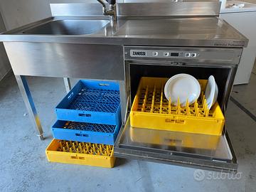 Lavastoviglie professionale Zanussi 3-4,5 kw con mobile acquaio e gocciolatoio, 2 cestelli per piatti, 2 cestelli vuoti, 2 cestelli per 25 bicchieri e 1 cestello per 49 bicchieri. Usato in ottime condizioni; visibile a Montesilvano (PE) su appuntamento (3483813195).