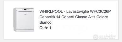 Vendesi lavastoviglie Whirpool WFC3C26P a libero incasso, perfettamente funzionante, usate pochissime volte (no garanzia), solo ritiro a mano (Nettuno) astenersi perditempo.