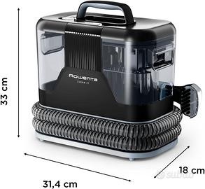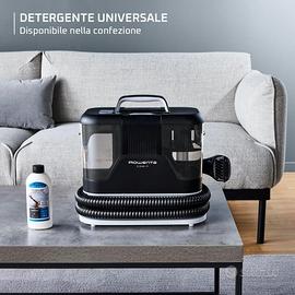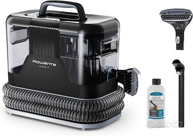 Rowenta Clean It, Lavatappeti Portatile, Lava Tappezzeria per Tappeti, Lava Divani e Auto con Testine Intercambiabili, 3,3 L, Doppio Serbatoio Acqua Pulita/Sporca e Sistema di Auto Pulizia, IN5010 CLEAN IT: Clean It di Rowenta è la soluzione ideale per gli incidenti quotidiani: una soluzione rapida ed efficiente per la pulizia quotidiana di sporcizia e macchie causate da animali domestici, liquidi versati, imprevisti e molto altro: avere una casa impeccabile è diventato semplice PULIZIA MULTIFUNZIONE: Clean It multifunzione consente di usufruire dell'azione di aspirazione e dell'azione smacchiante di strofinamento attraverso una soluzione di acqua e detergente per adattare la routine di pulizia quotidiana alle specifiche esigenze in modo funzionale, senza rinunciare a un design ergonomico facile da maneggiare e trasportare VERSATILITA': Le testine intercambiabili permettono una pulizia rapida ed efficace di tappeti, moquette, divani, interni dell'auto, tappezzeria e molto altro. Grazie al cavo elettrico di 5 metri e al tubo di 1,75 metri, si garantisce libertà di movimento e un ampio raggio d'azione PULIZIA PROFONDA QUOTIDIANA: Progettato per semplificare le operazioni di pulizia e riempimento, l’ampio serbatoio rimovibile da 1.8 L per l'acqua pulita e il serbatoio da 1.5 L per l'acqua sporca offrono un'ottima autonomia. In caso di macchie causate da animali domestici, è sufficiente spruzzare la soluzione detergente direttamente sulla superficie per una pulizia quotidiana che lascia un profumo gradevole FACILE MANUTENZIONE: La griglia posteriore amovibile e la spazzola per la pulizia inclusa rendono la manutenzione rapida e semplice, contribuendo a prolungare la durata del prodotto nel tempo CONTENUTO DELLA CONFEZIONE: Rowenta Clean It, spazzola da 8 cm, spazzola da 15 cm, accessorio per la pulizia automatica, soluzione detergente per tappeti e tappezzeria da 250 ml per le macchie