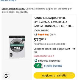 Nuova, perfettamente funzionante Codice modello CANDY MINIAQUA CW50-BP12307G-S, LAVATRICE A CARICA FRONTALE, 5 KG, 1200 GIRI Su amazon a 570 euro, vendo a meno della metà Solo ritiro a mano a Roma centro