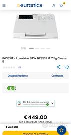 Lavatrice carica dall’ alto INDESIT 7 kg . Larghezza 40cm - Altezza 90cm - Profondità 60cm classe B Prodotto nuovo sui 430/450€ come da ultime due foto . Perfettamente funzionante e super comoda .