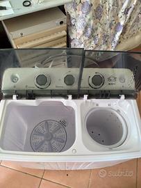 Lavatrice da campeggio usata poco. Lava da una parte e centrifuga dall'altra. Perfettamente funzionante, solo la molla che fa rimanere aperto il coperchio della centrifuga è rotta ma non inficia su niente.