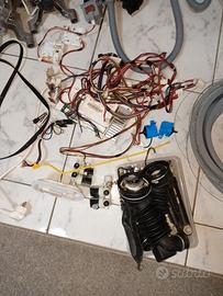 pezzi di ricambio per lavatrice Hotpoint Ariston AQ93F29IT, alcuni pezzi sono doppi come oblò, motore pompa scarico, cinghia, poi c'è la guarnizione oblò con 3 ferretti, scheda con i collegamenti elettrici e altre varie pompette. comunque i pezzi sono presenti nelle foto.