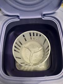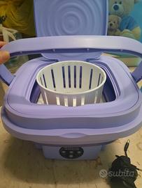 Lavatrice portatile e pieghevole, con 2 tipi di programmi (standard washing 10 minuti o soft washing 15 min) + 2 minuti di centrifuga finale. Ha valvola di scarico per togliere l acqua, e spina per attaccarla. L.ho usata pochissime volte infatti è in ottimo stato. Vendo per inutilizzo. Sotto ha 4 ventose.