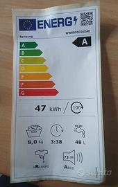 Vendo lavatrice SAMSUNG WW80CGC04DAE, Caricamento frontale, 8 kg, Profondità 635 mm, Bianca, livello rumorosità centrifuga 72 dB(A), Classe A Usata pochissimo, cedo perche non ci sta nel bagno di casa nuova. Ritiro a Cassano d’Adda.
