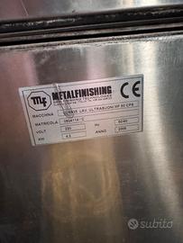 Vendo lavatrice industriale a ultrasuoni Metalfinishing modello LUS935 MF50 CPS. Macchina professionale adatta per lavaggio e pulizia di componenti meccanici, particolari metallici, officine e lavorazioni industriali. Caratteristiche: - Potenza: 4,2 kW - Frequenza: 50/60 Hz - Anno: 2005 - Alimentazione 220v - Struttura robusta in acciaio inox - Vasca capiente per lavorazioni di medie/grandi dimensioni Dimensioni: - Altezza: 100 cm - Larghezza: 65 cm - Profondità: 40 cm La macchina è completa e pronta all’uso. Ideale per rimozione di oli, grassi e residui di lavorazione tramite ultrasuoni. Condizioni: Usata, in buono stato generale (vedi foto). Note: Possibilità di prova su richiesta. Ritiro a mano preferibile vista la dimensione. Per informazioni contattare. Prezzo leggermente trattabile