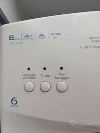Specifiche Tecniche Capacità: 6 kg, adatta a 2-3 persone o bucati piccoli. Centrifuga: 1000 giri/min (classe C), rumorosità 76 dB centrifuga / 60 dB lavaggio. Classe energetica: A+ (vecchia scala, equivalente F nuova UE; 0.9 kWh/ciclo, 55 L acqua). Funzionalità Principali Pulsanti per lavaggio a freddo, prelavaggio turbo e turbo lavaggio; 6 sensi (sensori auto per carico/detergente). Programmi eco/rapido, partenza differita, Aquastop, controllo schiuma. Dimensioni slim: 40x60x90 cm, ideale per spazi ristretti. Buono stato, non spedisco, ritiro al piano poco trattabile.