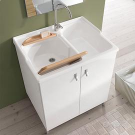 Lavatoi da interno in acrilico estremamente resistenti agli urti, agli sbalzi termici ed a tutti gli agenti chimici non corrosivi. Ante in Laminato bianco lucido, pannelli in conglomerato ecologico di legno (melaminico bianco), maniglia, in ABS Grigio ,piedini ABS, finitura alluminio, completa di asse in legno, piletta, sifone, troppopieno e griglia portasapone