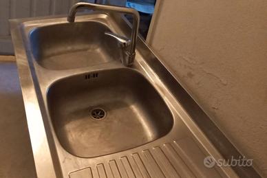 Lavello dotato di Alzatina da incasso, si presenta con 2 Vasche e gocciolatoio, in Acciaio Inox, completo di Miscelatore. Ottimo per Cucina, mobile sottolavello o Lavatoio Armadiato.