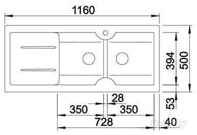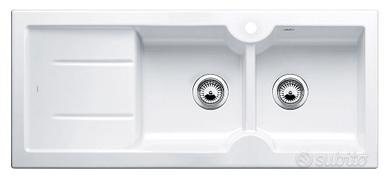 Il Lavello Blanco Idessa 8 S in ceramica porcellanata finitura bianco cristallo è dotato di due vasche con piletta da 3 1/2 ", tappo a cestello, sifone e gocciolatoio. E' caratterizzato da un basso spessore del bordo perimetrale, raggio vasca ridotto e un design raffinato