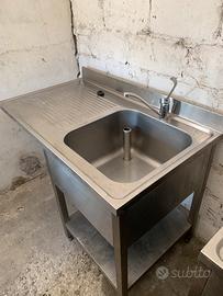 Causa inutilizzo, vendo lavello professionale in accaio inox, una pozza con gocciolatoio sul lato sinistro ed alzatina di 11 cm . Dimensioni : Ingombro massimo 120 x 70 h 87 con piedini regolabili . Dimensioni pozza 50 x 50 h 36 Dimensioni gocciolatoio 65 x 65 Dimensioni ripiano inferiore 63 x 58 Ottime condizioni, utilizzato per un breve periodo . Massima disponibilità per qualsiasi visione sul posto, graditi solo contatti telefonici per praticità, anche whatsapp . Disponibile all’invio su richiesta di ulteriori foto e o video ancora piu’ dettagliati . Possibilità di trasporto a domicilio nel raggio di 30 Km aggiungendo un supplemento per le spese di carburante . Massima serietà : Cristian 3203503221