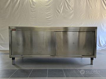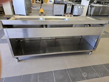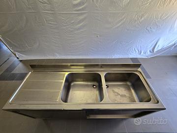 Commercialtecnica mette in vendita lavello su armadio a due vasche con sgocciolatoio in acciaio inox, marca Angelo Po. Dimensioni cm L200xP70xH100. Dotato – partendo da sinistra – di sgocciolatoio e due vasche ciascuna con dimensioni in cm di L60xP50xH35. Possiede due ante scorrevoli che forniscono l’accesso ad un ampio piano di fondo. Il lavello è usato e in buone condizioni. Spedizione in Sardegna gratuita, disponibile anche per spedizioni in altre regioni d’Italia. Pagamento tramite bonifico e su richiesta anche PayPal. All'atto della vendita verrà emessa regolare fattura. L’importo indicato è IVA INCLUSA.