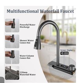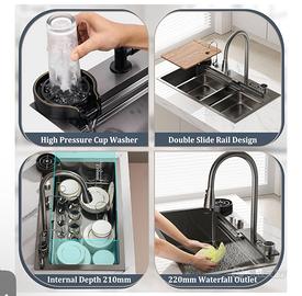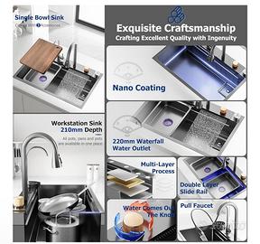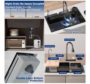 50 Cm Di Larghezza Nero Grande Cascata Lavello Cucina Acciaio Inox Set, Lavello Multifunzione1 Vasca Con Cascataterraneo Rubinetto, Lavandino Esterno Con Gocciolatoio E Vari Accessor(Black-Grey A,80x5