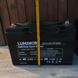 LDC12-120, Batteria AGM DEEP-CYCLE Batteries. 12V 120Ah. (20hr) Term. M8. Peso: 33Kg. Dimensioni: 330x172xh.215(221)mm. Principali applicazioni: Veicoli elettrici, carrozzine elettriche per disabili, batterie di servizio per Nautica e camperistica, Energie rinnovabili, Segnaletica stradale e tutte le applicazioni che richiedono cariche e scariche profonde giornaliere. Vendo anche separatamente (prezzo per uno 100), sempre completamente carica grazie ai pannelli solari. Utilizzato solo per l'illuminazione del camper. Vendo perché passo al lifepo4
