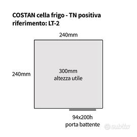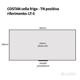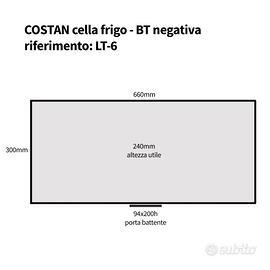 Vendiamo in blocco unico 6 celle frigorifere modulari COSTAN + 2 centrali frigorifere COSTAN (TN e BT). Non si cedono singole unità. CELLE FRIGORIFERE Rif.TipoMisure interne (LxPxA cm)Portamq LT-1TN Positiva240x810x300Scorrevole 120x20019,44 LT-2TN Positiva240x240x300Battente 94x2005,76 LT-3TN Positiva300x660x300Battente 94x20019,80 LT-4TN Positiva300x270x300Battente 94x2008,10 LT-5TN Positiva300x660x240Battente 94x20019,80 LT-6BT Negativa300x660x240Battente 94x20019,80 Incluso in ogni cella: evaporatore ventilato, quadro termostato + sbrinamento, pannelli 60mm (100mm per LT-6 BT). Pavimento incluso solo su LT-6. CENTRALI FRIGORIFERE Centrale TN COSTAN – Multiplex con 4 compressori BITZER, rack blu, quadro elettrico integrato. Centrale BT COSTAN – Unità compatta con quadro elettrico. Escluso: trasporto, smontaggio e montaggio. 💰 Prezzo lotto completo: €12.500 trattabile 📍 Visionabile e smontabile a Formia (LT) – franco nostro deposito, smontaggio escluso. 📩 Solo acquirenti seri – trattativa riservata. Contattare in privato.
