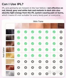 Luce pulsata ad impugnatura ergonomica per alleviare il carico di lavoro a lungo termine, pulsante di regolazione per scegliere l'intensità in linea con la propria tonalità di pelle, difatti nella confezione presente un foglio che mostra l'intensità da usare, secondo questa.