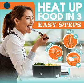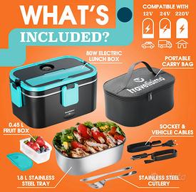 Lunch Box elettrica TRAVELISIMO 3 in 1 da 1,8L in acciaio inox, perfetta per ufficio, auto o camion. Riscalda e conserva il cibo con potenza 80W, compatibile 12V/24V/220V. Design termico con contenitore separato (taper) per pasti completi e pratici, ovunque tu sia. Ideale per pranzi caldi a lavoro, in viaggio o fuori casa.