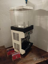 Macchina professionale per bevande fredde (detta anche slush machine). In pratica: le vasche trasparenti in alto contengono la bevanda; all’interno c’è una coclea che mescola continuamente; la base contiene il gruppo refrigerante che raffredda fino a ottenere drink ghiacciati; spesso viene usata in bar, chioschi, fiere o gelaterie per thè, slush, succhi freddi o cocktail analcolici.