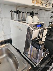 Vendo macchina da caffè superautomatica De’Longhi Eletta Cappuccino Top (modello ECAM 45.760.W), color bianco lucido e dettagli in acciaio. Vendo a prezzo di realizzo per passaggio immediato a modello superiore. La macchina è perfettamente funzionante, utilizzata regolarmente e mantenuta con cura (cicli di pulizia e decalcifica sempre eseguiti quando richiesti dal display). Fa un caffè eccellente grazie al macinacaffè integrato e ottimi cappuccini con la caraffa inclusa. Caratteristiche principali: •Sistema LatteCrema De’Longhi per cappuccini, latte macchiato, flat white con un solo tocco (caraffa latte inclusa, come da foto). •Macinacaffè integrato per usare caffè in chicchi (ma accetta anche caffè in polvere). •Display digitale multilingue facilissimo da usare. •Personalizzazione totale: intensità del caffè, lunghezza, temperatura e quantità di schiuma. •Funzione acqua calda per tè e tisane (beccuccio dedicato incluso). •Scaldatazze attivo nella parte superiore. Condizioni: Usata ma in ottime condizioni generali e perfettamente funzionante (vedi foto con display acceso). Leggeri e normali segni di usura estetici dovuti al normale utilizzo, che non compromettono in alcun modo il funzionamento. Meccanovalvola sostituita recentemente da centro assistenza autorizzato (componente praticamente nuovo), fattura lavoro disponibile su richiesta. Inclusi nella vendita: •Macchina Eletta Cappuccino Top •Caraffa latte originale •Erogatore acqua calda originale Per favore, no perditempo o offerte al ribasso. A questo prezzo (praticamente il costo di una macchina base) vi portate a casa un top di gamma. Ritiro a mano in zona oppure spedizione TuttoSubito. Contattatemi per qualsiasi informazione!