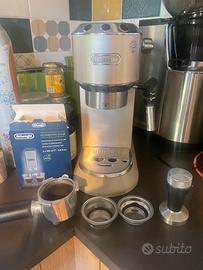 Vendo macchina da caffe de longhi dedica, scatola e pezzi originali, bar pack edition, usata pochissimo. Do in associazione anche set per anticalcare e pulizia come da foto. Vendo per inutilizzo.