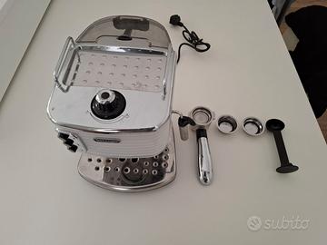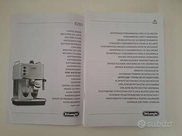 Macchina per il caffè espresso con cialde o polvere, colore bianco. Composta da caldaia in acciaio inossidabile, finitura laccate lucide con dettagli cromati. ECZ351.GY utilizza il Cappuccino System, sistema che combina vapore, aria e latte, producendo una schiuma ricca e cremosa per i grandi cappuccini. Portafiltro con dispositivo crema che consente di utilizzare il caffè in polvere o cialde E.S.E. Ripiano scalda tazze integrato che le mantiene in caldo e sempre pronte all'uso, proprio come al bar. Serbatoio estraibile (1.4 L) per agevolarne il riempimento e la pulizia. Spegnimento automatico dopo 20 minuti. Tenuta benissimo e usata poco, non ho più scatola originale.