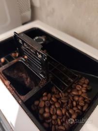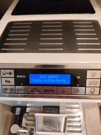 Macchina da caffè DeLonghi, colore bianco con bordi acciaio, edizione limitata. Ha la possibilità di personalizzare il proprio caffè come al bar, singolo, due contemporaneamente con regolazione d'intensità che può essere programmata, così come la lunghezza e la possibilità di salvare il proprio "Mio caffè", come appare in foto sul display.. Completo dell'erogatore del latte, con varie possibilità di cappuccino, con schiuma regolabile per tutti i gusti. Non vi piace il cappuccino ?, allora potete gustare il caffelatte, latte macchiato, milk menù. L'erogatore del latte è nuovo ed imballato perché il precedente, quello fotografato, è caduto a terra ed ha perso un pezzo. Regolazione in altezza dell'erogatore del caffè , così da poter utilizzare le tazze di vostro gradimento. Decalcificazione dell'acqua semplice ed automatica, basta seguire le indicazioni sul display. Possibilità di macinare il caffè o di utilizzare lo spazio riservato al caffè in polvere, quindi qualsiasi miscela abbiate, questo non limita la macchina DeLonghi. Assieme alla macchina vi fornirò 4 nuovi filtri non utilizzati.
