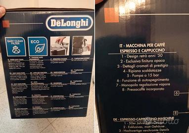 Vendo causa inutilizzo macchina caffè DeLonghi Icona Eco 310.W, colore bianco, capacità acqua 1.4 Litri, potenza 1100 W, pressione 15 bar, ripiano scaldatazze, peso 4.9kg, dimensione 26 cm x 29 cm x 31.5 cm, sistema cappuccino, utilizzabile sia con caffè in polvere, sia con le cialde ESE 44mm, ottime condizioni, perfettamente funzionante, astenersi perditempo.